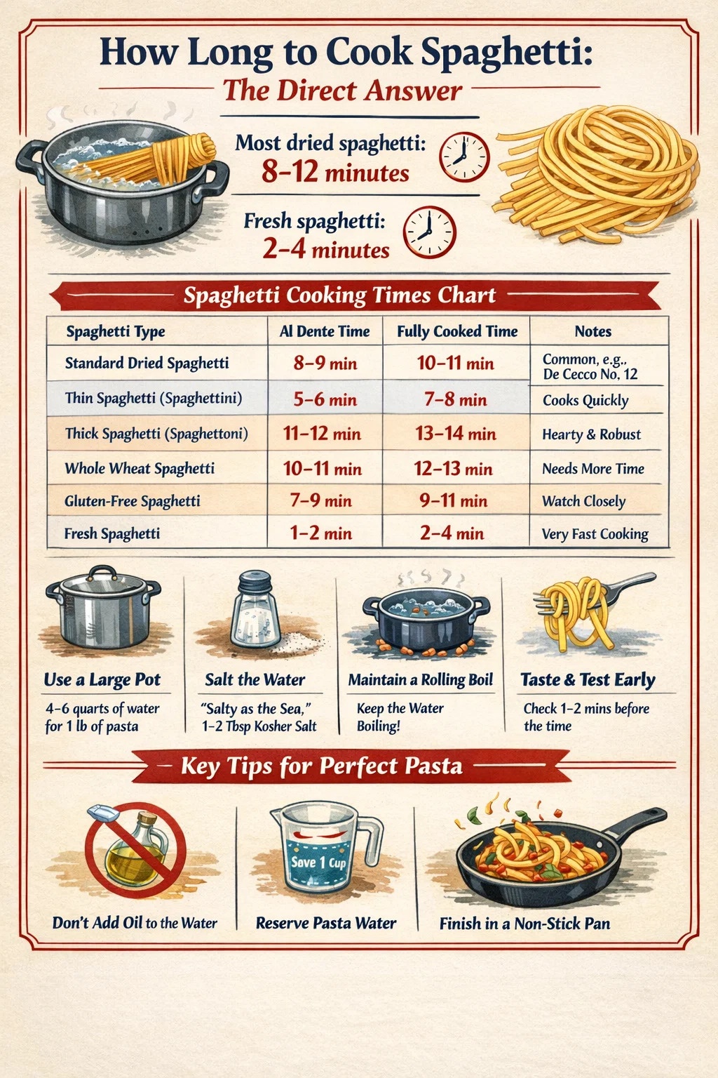 Špagety (tenčí, u mnoha značek č. 5) se obvykle vaří v 5 až 7 minut oproti 8 až 11 minutám u standardních špaget. Tenčí prameny jsou jemnější a snadno se převaří, proto je důležité konzistentní ochutnávání od 4 minut.