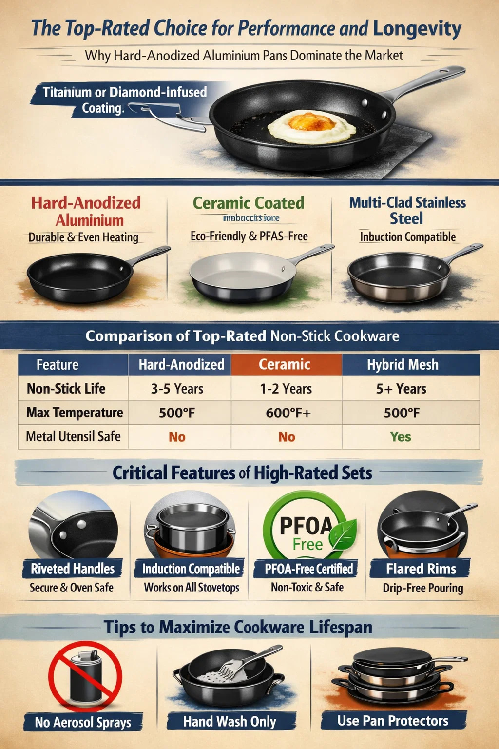 Nejlépe hodnocené nepřilnavé nádobí v současnosti na trhu dominuje Tvrdě eloxovaná hliníková pánev , konkrétně modely s vícevrstvými zesílenými povlaky. Profesionální kuchaři a domácí kuchaři trvale řadí tyto sady na nejvyšší místo, protože překlenují propast mezi snadným uvolňováním jídla a robustní trvanlivostí. Značky, které využívají povrchy vyztužené titanem nebo diamanty získat nejvyšší známky za odolnost proti poškrábání a zachování kluzkosti po dobu více než 5 let každodenního používání.